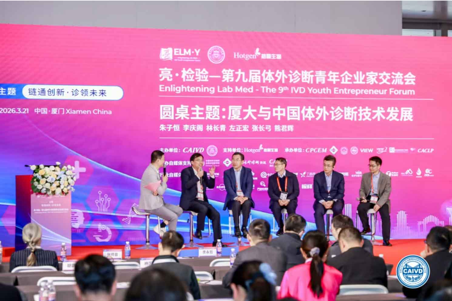 会议最后,由深圳望睿投资联合创始人朱子恒主持的圆桌论坛《厦大与中国体外诊断技术发展》,将整场会议气氛推向高潮。厦门大学附属翔安医院党委书记左正宏教授、李庆阁教授、林长青董事长、厦门波生生物技术有限公司创始人张长弓、厦门英博迈生物科技有限公司总经理熊君辉参与了讨论。各位学者共同回顾了厦门大学生物学科对IVD产业的技术支撑与人才输送,从91级博士到10届硕士,嘉宾们跨越二十余年的校友情谊,生动诠释了“薪火相传”的厦大精神。现场金句频出,掌声不断。