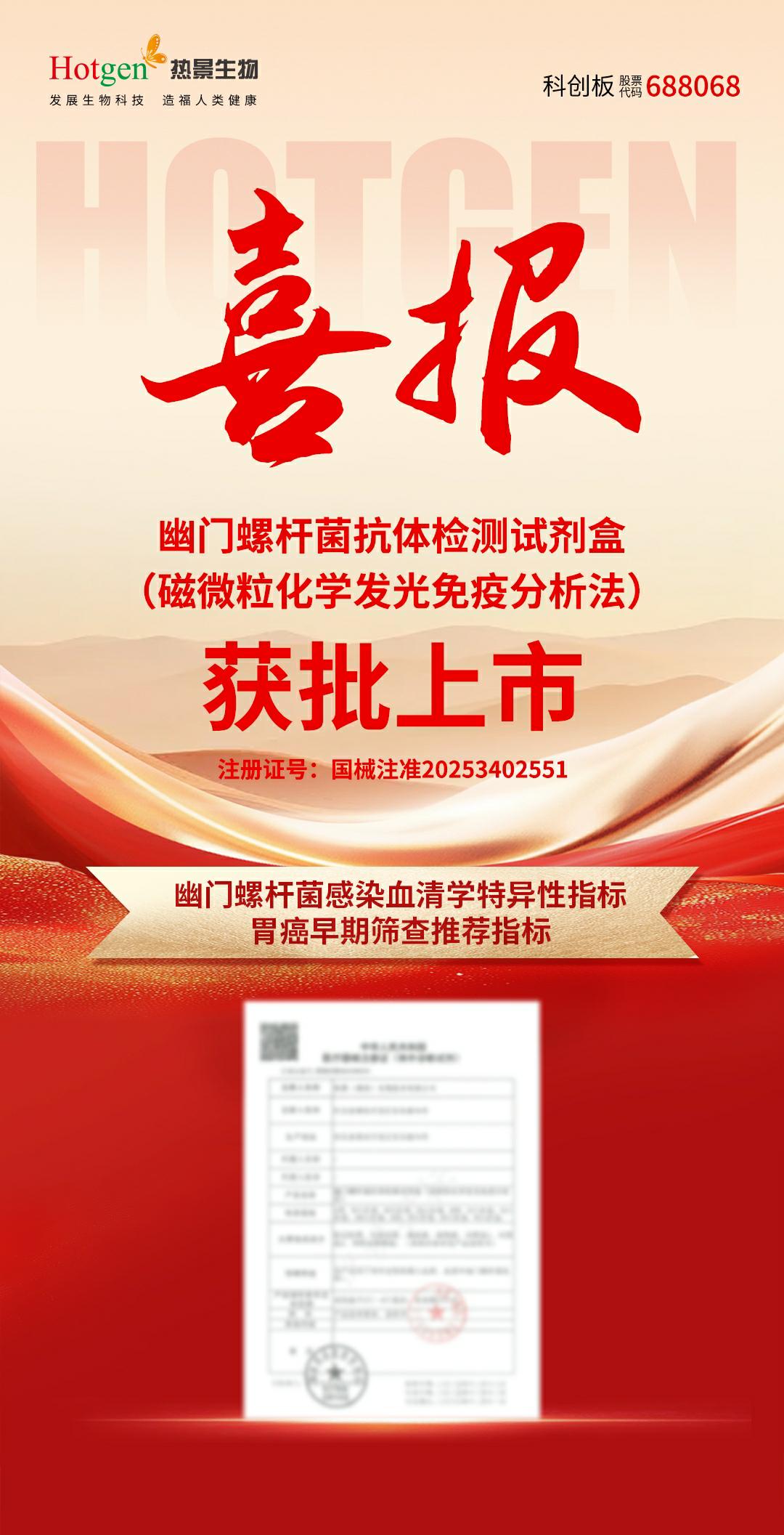 近期,北京热景生物凭借深厚的研发积淀与技术创新实力,成功斩获一项新的医疗器械注册证——幽门螺杆菌抗体检测试剂盒(磁微粒化学发光免疫分析法)正式通过国家药品监督管理局批准!这是继胃蛋白酶原Ⅰ(PGⅠ)、胃蛋白酶原Ⅱ(PG Ⅱ)和胃泌素17(G17)后的第四个胃功能检测项目,丰富了热景生物在胃病管理领域的产品矩阵,为临床诊疗提供更精准的解决方案,为胃癌早期筛查提供更全的有效依据。