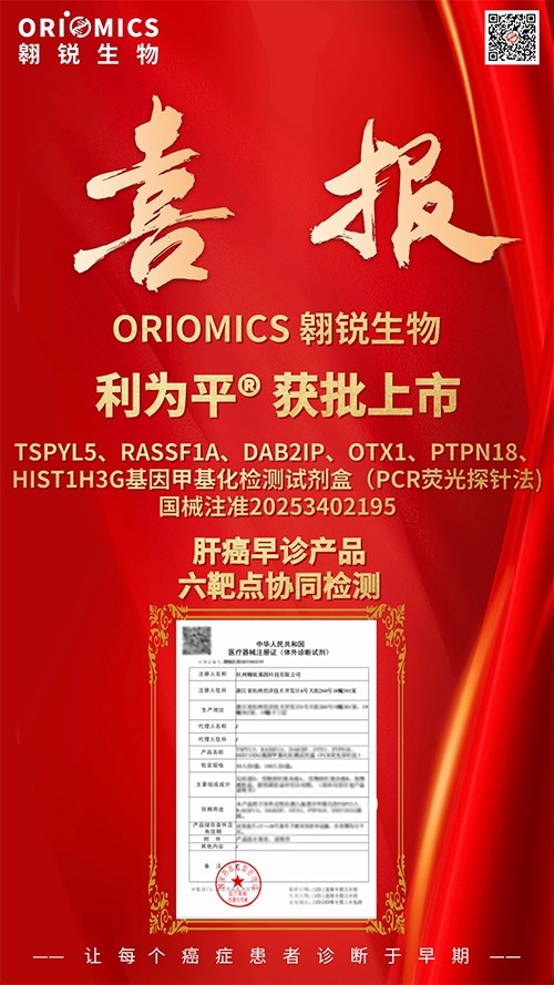 近日,热景生物重要参股公司翱锐生物自主研发的利为平®——TSPYL5、RASSF1A、DAB2IP、OTX1、PTPN18、HIST1H3G基因肝癌甲基化检测试剂盒(PCR荧光探针法)获得国家药品监督管理局颁发的Ⅲ类医疗器械注册证(注册证号:国械注准20253402195)。该产品用于体外定性检测人血浆中相关基因甲基化,适用于临床上对疑似原发性肝癌的辅助诊断。