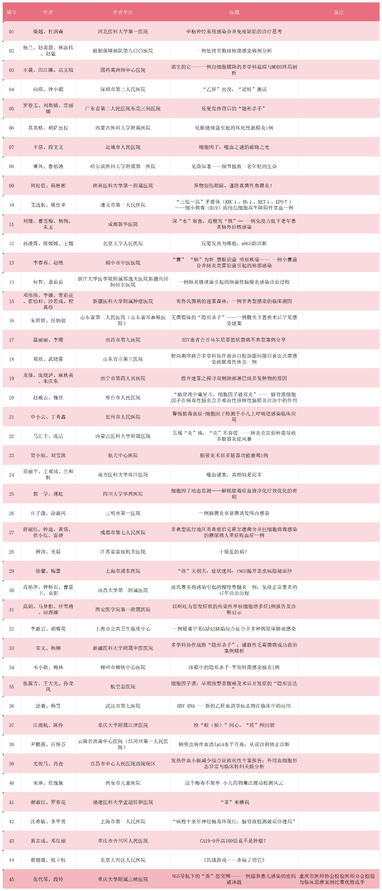 为了有效推动检验与临床的深度融合,进一步提升检验人员的临床思维能力,在中华医学会检验医学分会青年学组指导下,西部数智医疗研究院、《检验医学》杂志、检验医学新媒体主办,白求恩精神研究会检验医学分会细胞因子与疾病检测学组、北京热景生物技术股份有限公司协办的「第五届检验与临床(感染性疾病)思维案例展示活动」已全面启动。在面向全国进行征稿,并对稿件进行双盲双审(同一篇稿件均由2位专家进行评审)后,根据评审结果,共纳入复审稿件45篇。以下为详细名单,排名不分先后。