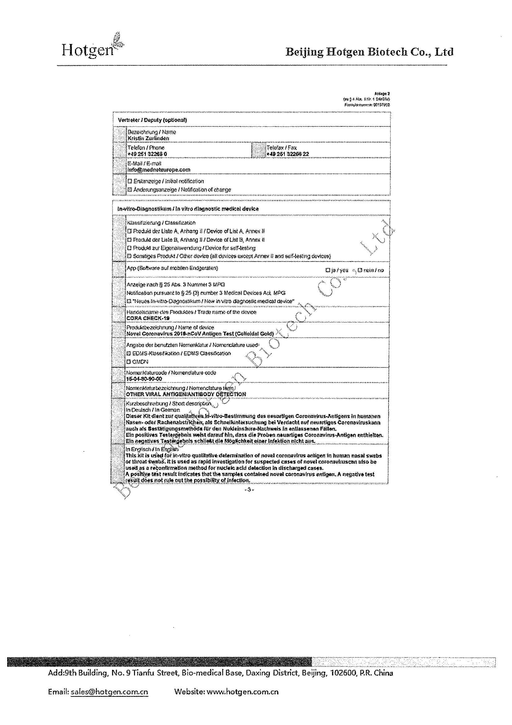 CE Certification Statement for Novel Coronavirus 2019-nCoV Antigen Test (Colloidal Gold)